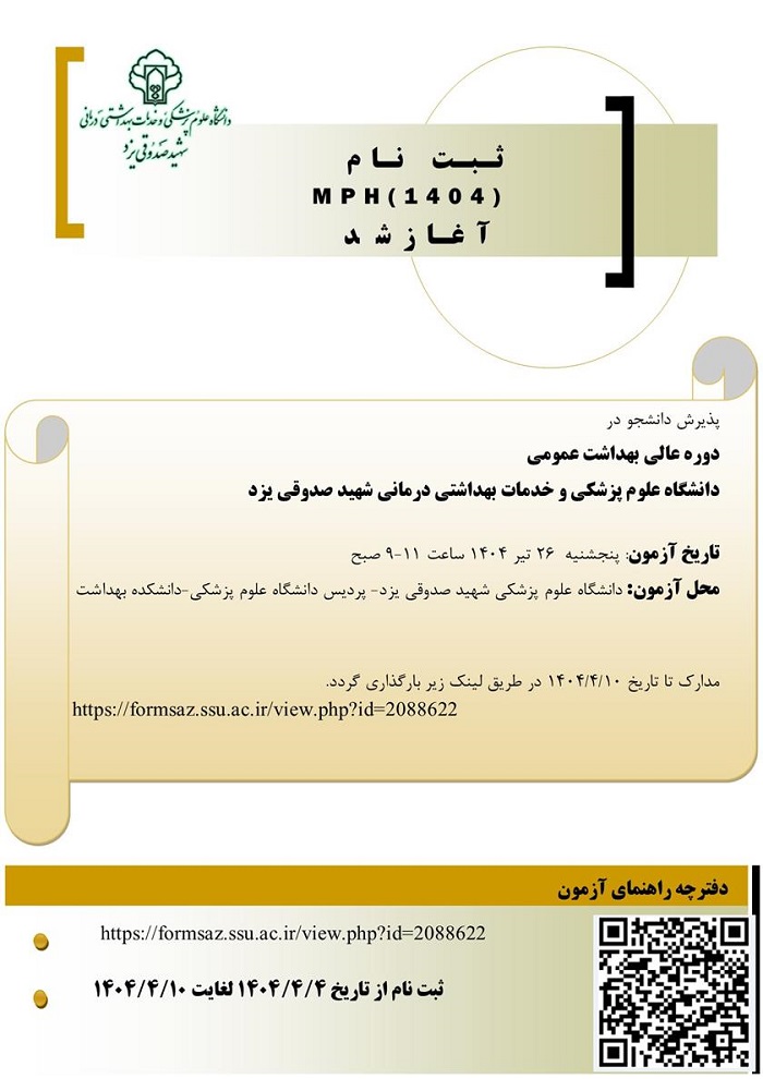 به اطلاع کلیه همکاران و دانشجویان واجد شرایط می رساند، دانشگاه علوم پزشکی شهید صدوقی یزد در نظر دارد با توجه به واگذاری برگزاری آزمون غیر متمرکز کتبی و مصاحبه پذیرش دانشجو در دوره عالی بهداشت عمومی MPH در سال تحصیلی ۱۴۰۴-۱۴۰۵ از وزارت متبوع به دانشگاه های مجری و دارای مجوز، آزمون دوره آموزش عالی بهداشت عمومی MPH گرایش مبارزه با بیماریها را برگزار نماید.