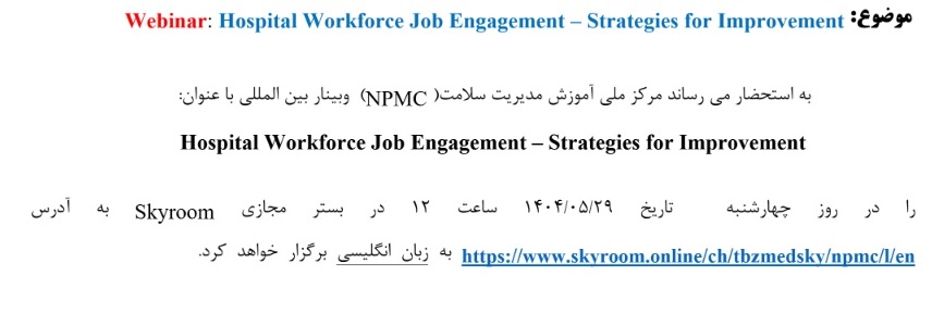 وبینار آموزشی بین المللی Hospital Workforce Job Engagement – Strategies for Improvement ۲۹ مرداد ۱۴۰۴ | ۱۰:۰۱ کد : ۵۳۹۲۵ اطلاعیه ارسال به دیگران نام شما ایمیل شما ایمیل دریافتکننده ارسال انصراف تعداد بازدید:۳۷۹ وبینار آموزشی بین المللی Hospital Workforce Job Engagement – Strategies for Improvement