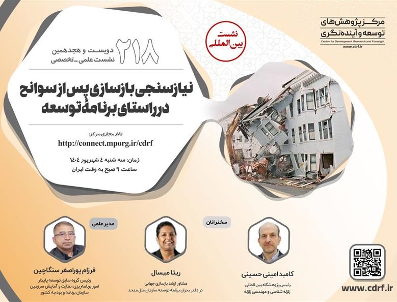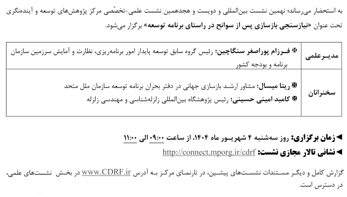 نشست علمی نیاز سنجی بازسازی سوانح در راستای برنامه توسعه ۰۳ شهریور ۱۴۰۴ | ۱۲:۳۷ کد : ۵۴۰۰۰ اطلاعیه ارسال به دیگران نام شما ایمیل شما ایمیل دریافتکننده ارسال انصراف تعداد بازدید:۲۹۵ نشست علمی نیاز سنجی بازسازی سوانح در راستای برنامه توسعه، توسط مرکز پژوهش های توسعه و آینده نگری برگزار می گردد.