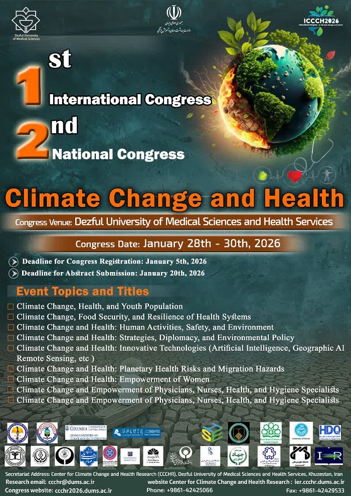 به اطلاع اعضای محترم هیئت علمی، پژوهشگران، دانشجویان و علاقه مندان می رساند، اولین کنگره بین المللی تغییر اقلیم و سلامت، توسط دانشگاه علوم پزشکی دزفول، با حضور اساتید، پژوهشگران، صاحب نظران داخلی و بین المللی در حوزه سلامت و اقلیم برگزار خواهد شد. هدف از برگزاری این کنگره بررسی اثرات مستقیم و غیر مستقیم تغییرات اقلیمی بر سلامت انسان، نظام سلامت، زیر ساخت های درمانی و آمادگی در برابر مخاطرات نوظهور زیست محیطی است.مقالات برگزیده پس از داوری علمی در مجموعه مقالات کنگره منتشر و برخی از آنها جهت چاپ در نشریات معتبر علمی معرفی خواهند شد. همچنین گواهی حضور و ارائه مقاله برای شرکت کنندگان صادر خواهد شد.